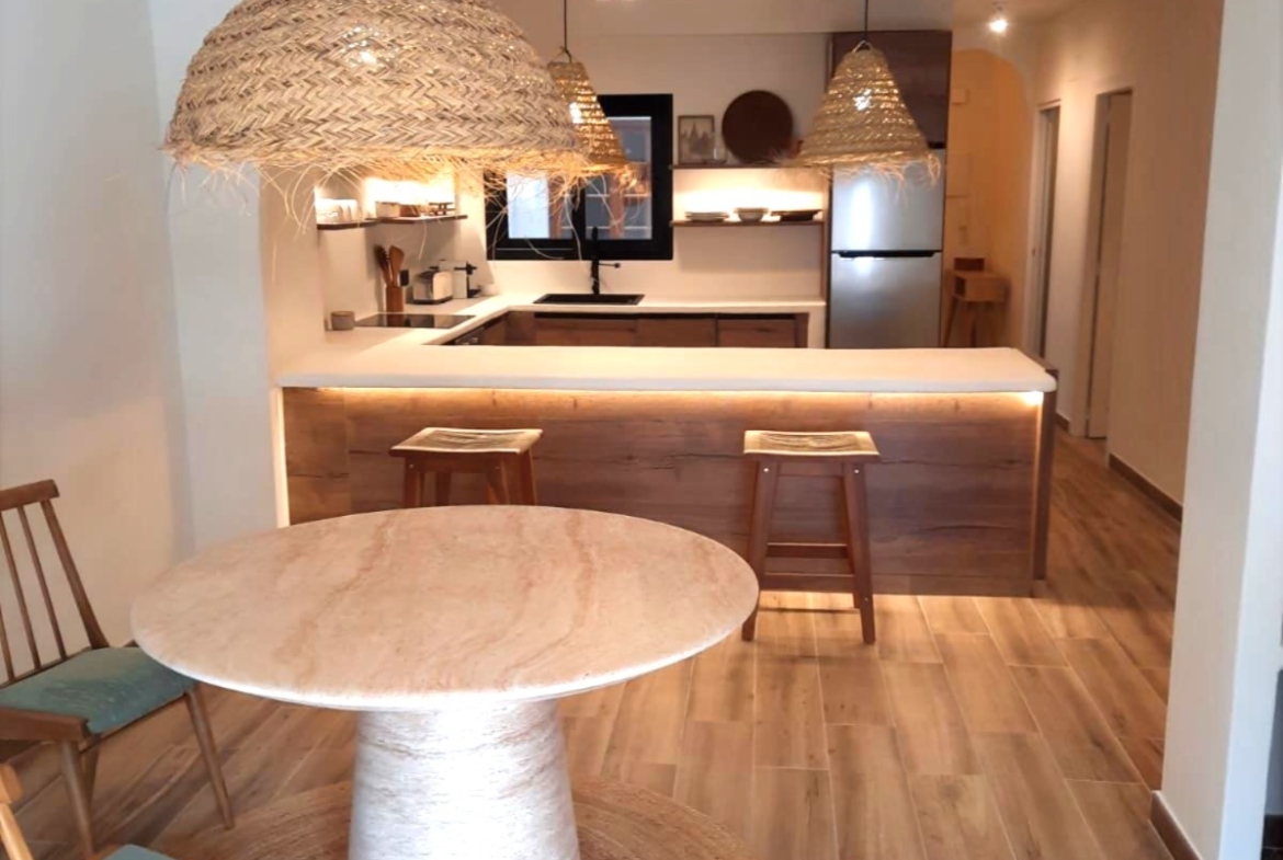 En el corazón del puerto de Jávea, junto a toda clase de servicios y un minuto andando de la playa, apartamento con mucho encanto y decorado con estilo ibicenco, en primera planta con ascensor, orientación sur, con terraza con algo de vistas al mar