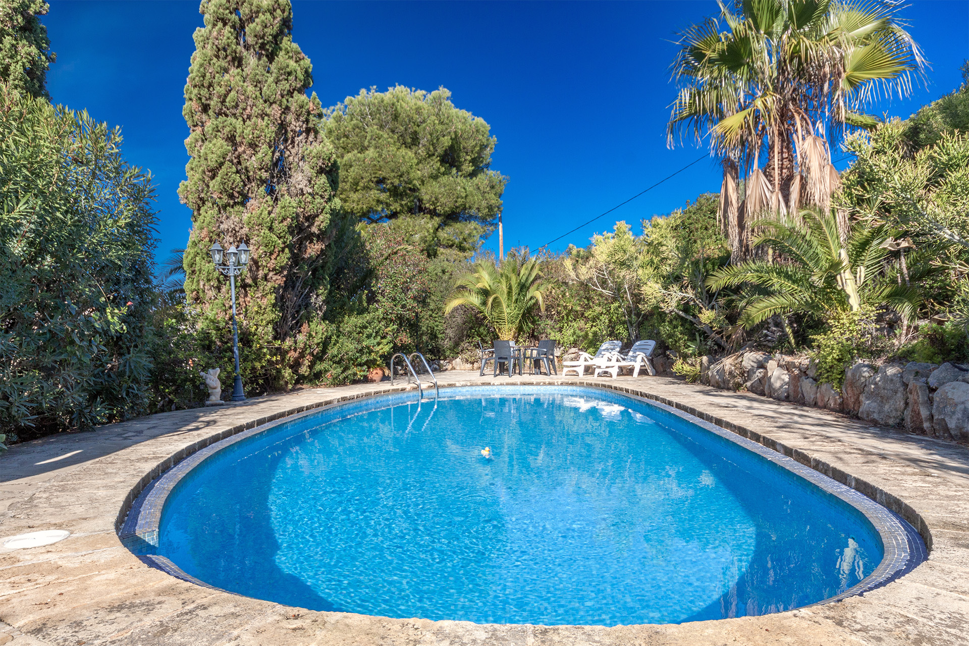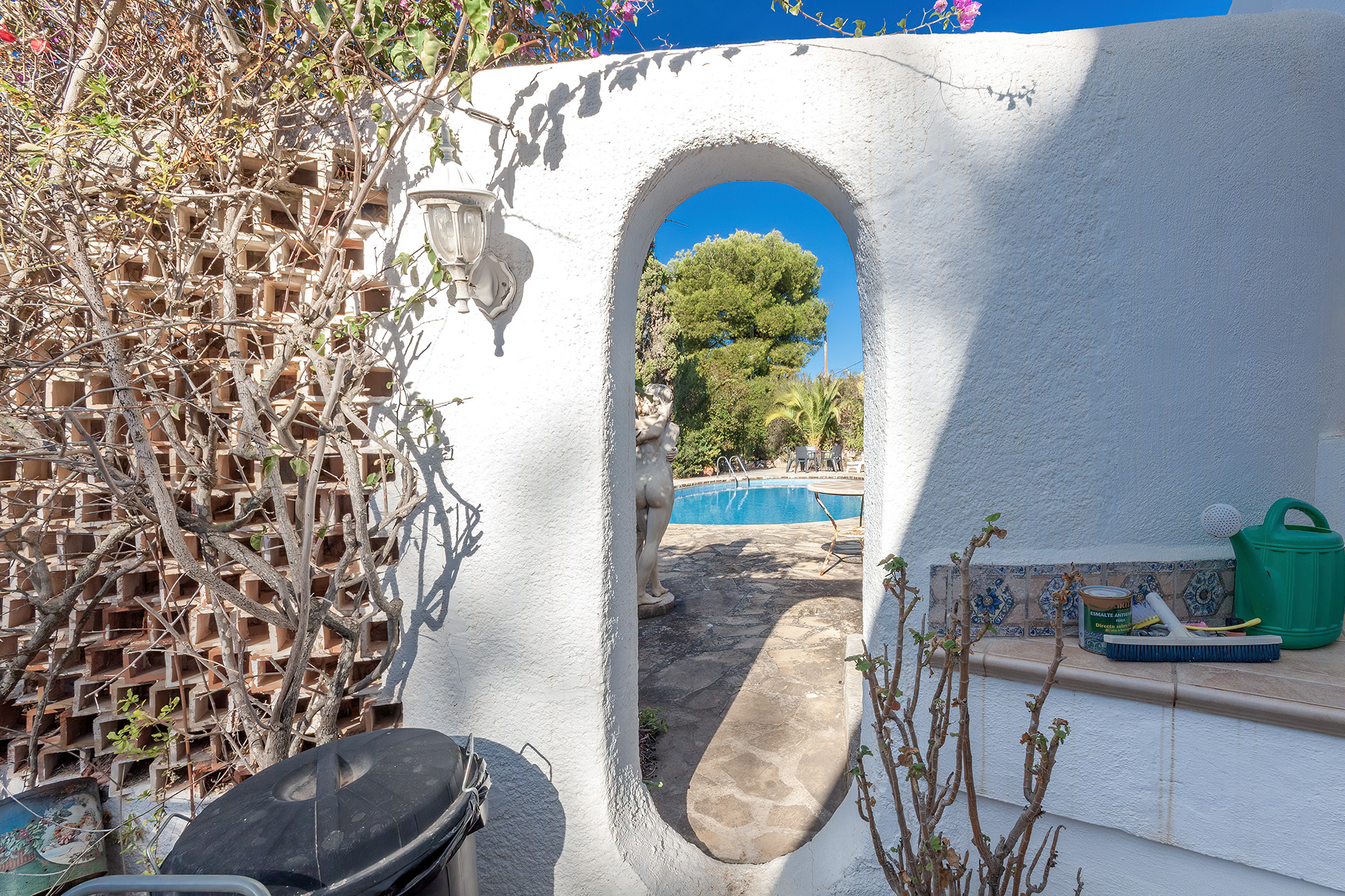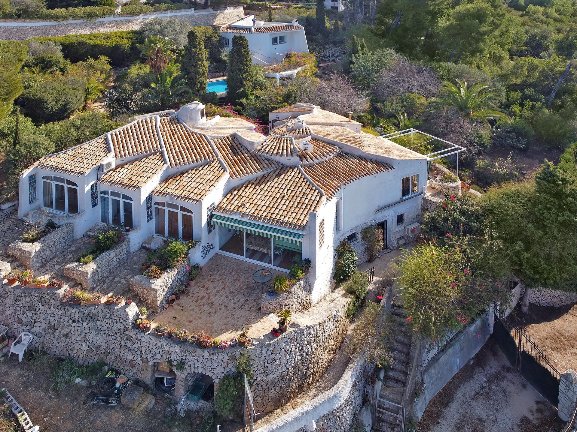 Consta de 2 propiedades con un total de 351m2 construidos en una parcela de 2191m2 (parcela urbana), en distintos niveles , dónde las viviendas se integran perfectamente. La casa grande alberga la vivienda principal y un apartamento para invitados. En la planta superior se ubica la vivienda con salón-comedor, cocina, 3 dormitorios ,3 baños (uno en suite) y 2 terrazas. En la planta inferior se encuentra la vivienda de invitados con acceso independiente, con salón, dormitorio y baño. La casa pequeña se utiliza actualmente como lugar de trabajo con 2 habitaciones, aseo y trastero. Del mismo arquitecto existen planos para una tercera pequeña edificación. La parcela con jardín mediterráneo de fácil mantenimiento con caminos iluminados en cuyo centro se ubica una piscina de 11x5m muy privada.